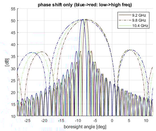 For wide-band emitted signals, however, the same phase shift generates different scan directions of the array factor since the phase shift and direction coincide only for a single frequency. In practice, for a monochromatic signal, , applying a delay or a phase produces the same effect: and , where . For a non-monochromatic signal, the application of a constant phase shift will produce different delays at different frequencies. This effect is known as frequency dispersion []. In Figure 1, an example of frequency shift due to the use of phase shifters only at different frequencies is shown. The modulation effect of the directivity is due to the embedded pattern of the single element.