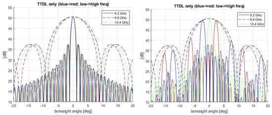 For this reason, according to Step 2 of the strategy defined in Section 2.1, a set of true time delay lines was designed to achieve the full coverage of the swath. The TTDLs do not create mispointing on the main lobe, but create a frequency dispersion on the grating lobes because of the stretching of the angle axis (see Figure 2, left panel). The position of the first grating lobe depends on the wavelength . It is derived from the expression of the periodic sinc representing the array factor of the array antenna []: