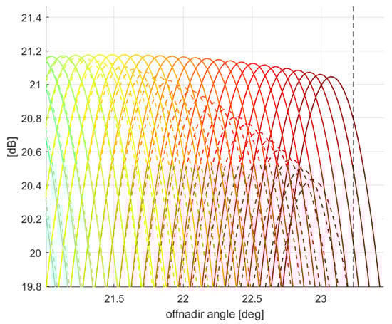 A remarkable aspect when designing an f-SCAN system is the need to have an optimal weighting of the range-variant central frequency (namely: the red dashed line in Figure 4) by the scanning pencil beam, so as to gather the maximum energy. In this perspective, the scanning beam is a further degree of freedom, whose design was already addressed in Section 2.2. Further insight on this point is detailed in Appendix A.