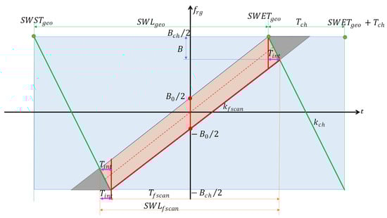 On the other hand, the geometric range resolution is a user requirement that determines the band B. The relation between and B is illustrated in Figure 4; B is the vertical projection of the intersection between the chirp line and the steering strip.