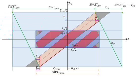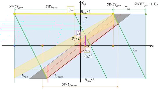 To describe the f-SCAN acquisition in such diagrams, we refer to Figure 4. We assumed a chirp pulse of duration and total bandwidth . Indeed, these parameters are often fixed by the SAR system electronics and mode design (e.g., PRF). The chirp rate is the ratio between the total bandwidth and the chirp duration: . In the T-F diagram, the chirp signal is represented by the green lines with a negative slope (a down chirp was assumed).