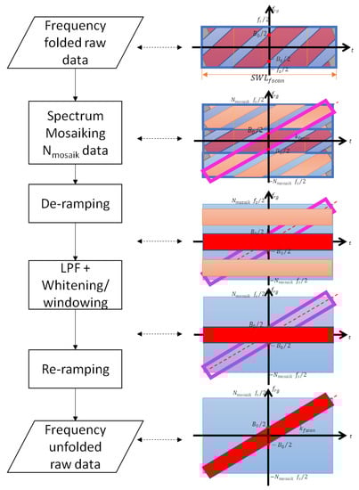 with . The third step is the application of a low-pass filter (LPF) to select only one spectral replica (the one in the baseband) among the . Please note that: (i) the nominal bandwidth of the LPF is , according to Equation (18), and (ii) together with the LPF, it is possible to apply a whitening filter (to compensate any spectral distortion) and/or a spectral windowing to give the spectrum the desired shape. This is commonly used in SAR processing to regularize the shape of the IRF The last step to accomplish the frequency unfolding is to reramp the data by multiplying it, in the time domain, by the conjugate of Equation (22).