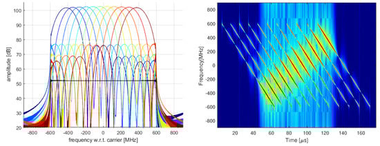 Successively, a MATLAB simulator was developed and set up with 11 ideal point targets aligned at the same azimuth and equally spaced in the off-nadir interval, from 19.9 deg to 23.68 deg (border effects were excluded). Each target was illuminated by a portion of the complete chirp due to being set in a given geometric position. Due to the antenna pattern shape (the embedded pattern of each radiator element was supposed to be a sinc shape), the frequency interval of each target was also pattern-shaped, as illustrated in Figure 8, left panel. The colour code in the figure is proportional to the frequency interval: hot colours for high frequencies; cold colours for low frequencies. Since each target generates a signal response at a different time and with different spectral support, the time–frequency diagram resulted in a sequence of lozenge supports, as shown in Figure 8, right panel.