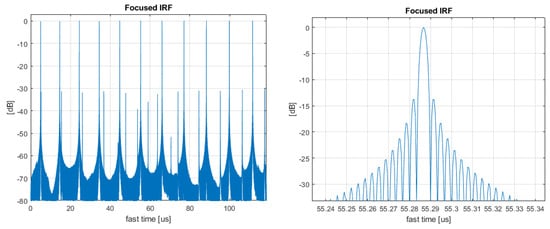 The range line after pre-processing can be compressed as in a traditional SAR system, i.e., correlating the range line with the reference pulse replica. The compressed range line is shown in Figure 10. As expected, the effect of subsampling generated spurious peaks (i.e., “ghosts”) whose level was, anyway, acceptable, being 30 dB lower than the peak. Due to the whitening (no windowing was applied in the simulation), the peak had the usual sinc shape (see Figure 10, right panel).
