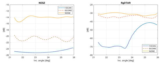 In order to quantify the capability of the f-SCAN system, here, we compared the system defined in Section 4 with two equivalent systems: (i) a traditional SAR acquiring in stripmap mode; (ii) a SAR using digital channels in elevation to obtain SCORE. In the two cases, the chirp bandwidth was set to B = 304 MHz (to achieve the same range resolution), and the swath extension was as in the f-SCAN simulation, i.e., about 44 km. Moreover, in the case of SCORE, eight digital channels were used. In Figure 12, the comparison between the NESZ and the RgDTAR of the three systems is provided. We can clearly see that the f-SCAN outperformed the other two systems both on NESZ and the RgDTAR.