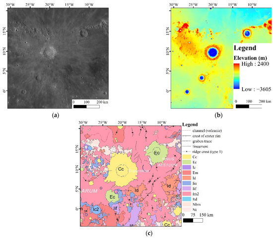 Copernicus crater and the surrounding area. (a) Copernicus area on a LROC WAC Global Morphology Mosaic; (b) Copernicus area on a LROC WAC DTM GLD100; (c) Copernicus area on a “Unified Geologic Map of the Moon, 1:5M, 2020”.