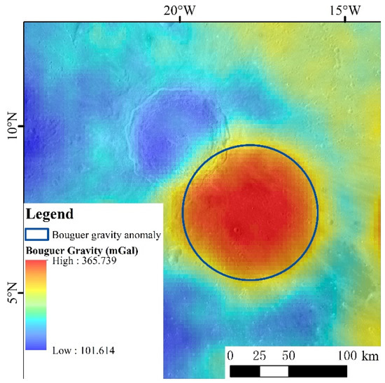 The Bouguer gravity anomaly is calculated by removing the separately measured topography. A typical peak-ring basin usually has a large positive Bouguer gravity anomaly within the peak-ring and a small or negative anomaly between the peak-ring and the inward edge of the rim [19]. This pattern is helpful to recognize the degraded basins that lack apparent rings.