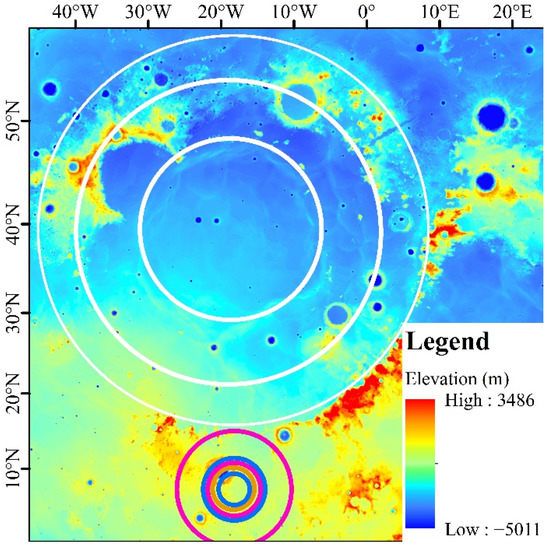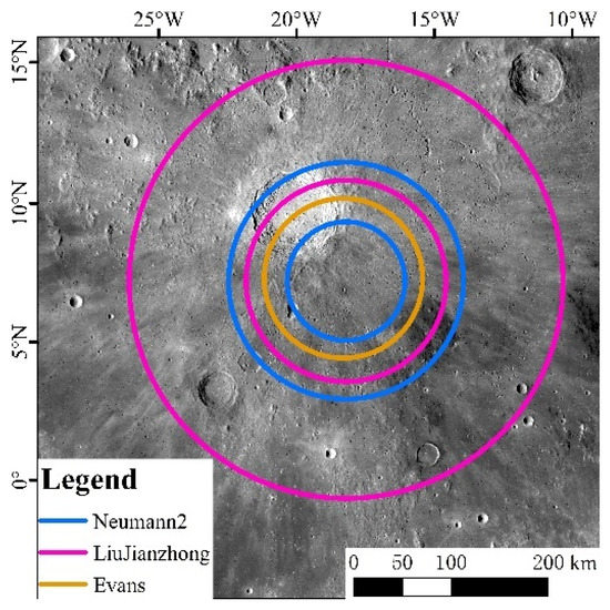 Some previous studies gave out a diverse scale of the C-H basin. Neumann et al. measured the mascon as a buried peak-ring basin which is located at 7.2°N 18.2°W, with a rim diameter = 260 km and a peak-ring diameter = 130 km [16] (blue circle in Figure 3). The results of Liu et al. confirm the basin type and the location of the central part of the basin, but they provide different values for the rim-to-rim diameter (483 km) and for the ring diameter (221 km) [24] (pink circle in Figure 3). Evans et al. measured the mascon as a single ring basin, located at 7.28°N 18.26°W and 175 km in diameter (orange circles in Figure 3) [13]. The study of Klokočník et al. did not focus on the features except the gravity and magnetism. They only pointed out that the diameter of the C-H basin had ahigh gravity anomaly that is about 150–160 km and they did not indicate the center position of the C-H basin [20].