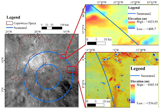Most of the basin rim and the peak-ring disappeared from the lunar surface. However, at the north-eastern part of Neumann’s basin rim, two rims are still visible, as can be observed in Figure 4. Both surviving rims are about −1140 m high.