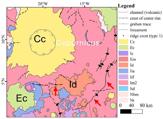 As previous research suggests, some mascons surrounded by linear rilles or mare ridges are impact craters/basins filled with basalts [34]. Therefore, the geological map is used to check if there are rilles or ridges around the mascon beside Copernicus.