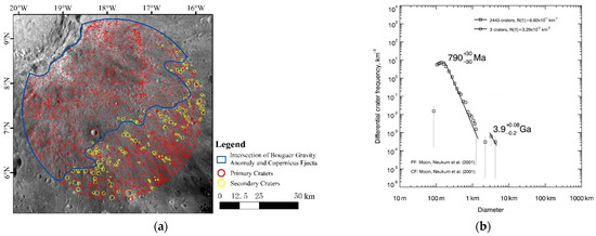 Bouguer gravity anomaly CSFD dating. (a) Primary craters (red) and secondary craters (yellow) in the intersection of the Copernicus ejecta and the Bouguer gravity anomaly (blue); (b) Differential crater frequency and geologic time of the Bouguer gravity anomaly.