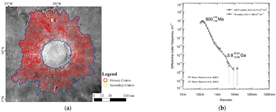 Copernicus ejecta CSFD dating. (a) Primary craters (red) and secondary craters (yellow) in the intersection of the Copernicus ejecta; (b) Differential crater frequency and geologic time of the Copernicus ejecta.