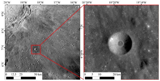 - Robbins, S.J. A New Global Database of Lunar Impact Craters >1–2 km: 1. Crater Locations and Sizes, Comparisons With Published Databases, and Global Analysis. J. Geophys. Res. Planets 2019, 124, 871–892. [Google Scholar] [CrossRef]
