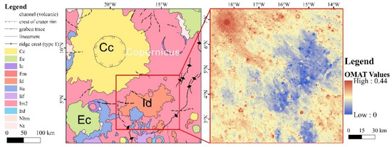 The DMD area Sinus Aestuum-I [48] is located on the south-east part of the mascon (Figure 11). It is 90 km across and situated on small highland hills. The OMAT map on Figure 11 shows that the Sinus Aestuum-I DMD has a lower OMAT value than the surrounding mare and has been heavily disrupted by the ejecta and the secondary impacts. This evidence suggests that the Sinus Aestuum-I DMD formed earlier than the surrounding mare, as well as the Copernicus crater.