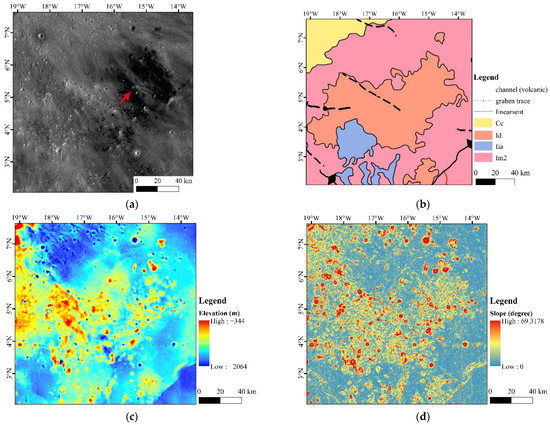 Sinus Aestuum-Ⅰ DMD. (a) Sinus Aestuum-Ⅰ DMD on the Kaguya TCortho Mosaic, the red arrow points to the radial texture from Copernicus; (b) Geological map of the Sinus Aestuum-Ⅰ DMD; (c) Elevation of the Sinus Aestuum-I DMD; (d) Slope of the Sinus Aestuum-Ⅰ DMD.