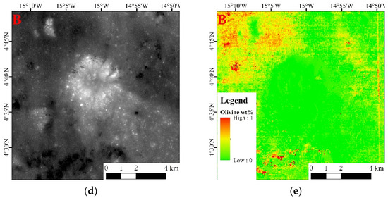 What’s more, the Sinus Aestuum-I DMD is another olivine-bearing occurrence near the C-H basin. We found two craters in the Sinus Aestuum-I DMD from which we can learn more about the olivine rich strata. As Figure 16 shows, compared with the Sinus Aestuum-I DMD, olivine inside both craters is poorer. Considering that the depths of these two craters are 190 m (Figure 16b,c) and 350 m (Figure 16d,e), respectively, and much shallower than Copernicus H (Figure 9). Thus, olivine in Copernicus H is also different from the olivine in the Sinus Aestuum-I DMD. Above all, the opinion of Bell et al. that Copernicus H exposes Im2 under the Copernicus ejecta is still reliable [46].