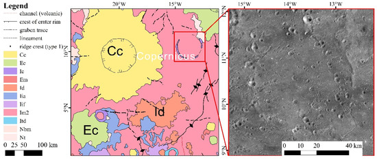 Copernicus is one of the most prominent craters on the Moon. It constitutes a classic example of a relatively young, well-preserved lunar impact crater. Copernicus is found in the Oceanus Procellarum, located at 10°N, 20°W, near the southern rim of the Imbrium Basin (Mare Imbrium) impact structure (Figure 1). Copernicus measures 93 km (58 miles) in diameter. The abundant geomorphic features are developed in the impact crater, such as the central peak, the ladder-like crater wall, the catena, and the extensive fusion coating [21]. Copernicus has a young geological age and a well-defined ray system and is classified as a highland crater. As the geological map shows (Figure 1c), the crater is located on Montes Carpatus. This is a highly diverse morphological area and is characterized by peaks and elevated terrains (Nbm in Figure 1c). In addition, it is punctuated by valleys and low-elevation corridors that are mostly flooded with mare-like materials (Em and Im2 in Figure 1c) [22]. The occurrence of the Copernicus impact resulted in the formation of an ejecta blanket (The largest Cc part in Figure 1c). What’s more, there are many Imbrian and Eratosthenian craters in the area (Ic and Ec in Figure 1c). Thus, the impact occurred on a highly stratigraphically complex and heterogeneous region of the lunar surface, mostly composed of feldspathic highland materials rather than mare [23].