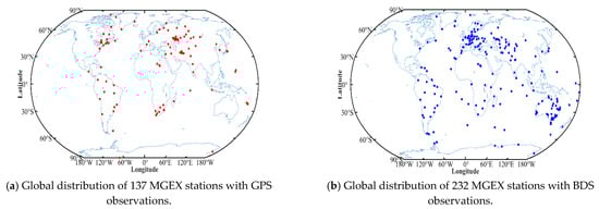 Global distribution of (a) 137 MGEX stations with GPS observations and (b) 232 MGEX stations with BDS observations.