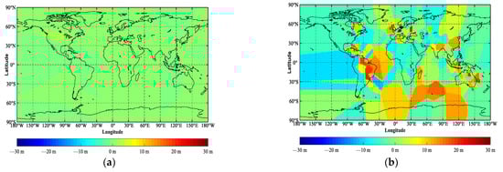 We selected the observation data of C2 and P2 code pseudorange in GPS from 137 MGEX stations on 29 July 2022. At the same time, the observation data of B1I and B3I code pseudorange in BDS from 232 MGEX stations on the same day were selected. The distribution of these stations is shown in Figure 1. The sampling interval of each station in the MGEX network is 30 s, and each day contains 2880 epochs. The number of GPS and BDS visible satellites in each epoch is about 6–16. There are more visible satellites in individual areas or stations. In particular, BDS has more visible satellites in China than in other regions. Each epoch has GNSS pseudorange observation information.