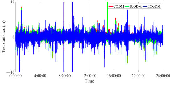 The three methods described in Section 4.4 can all judge blunders well according to the calculated test statistics and thresholds. The thresholds given in this paper are 5 m and 15 m, while the thresholds given in [] are 10 m and 30 m, which are half the values presented in the existing literature. For the sake of conservativeness, the analysis in this section is based on the threshold given in the literature.