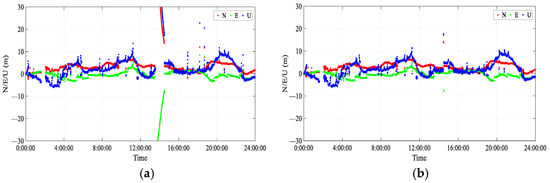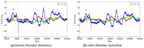 Figure 10 shows the coordinate time series of the SC04 station in North (N), East (E) and Up (U) directions before and after blunder detection in SPP. Figure 11 shows the coordinate time series of the BRMG station in three directions.