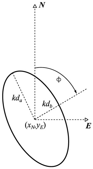 The “elliptical” presentation of a protection level could provide navigators with an extra benefit coming from knowledge of N-E variances and their covariance resulting in changes of the ellipse’s orientation and shape. The algorithm of the GNSS positioning integrity assessment in maritime domain in such a case can be based on the calculation of a protection ellipse (PE) specified by 4 parameters, i.e.: (1) semi-major axis of the estimated 1σ position error ellipse da (m), (2) semi-minor axis of the 1σ error ellipse db (m), (3) orientation of the error ellipse Φ, and (4) coverage factor k (see Figure 5 and (7)).