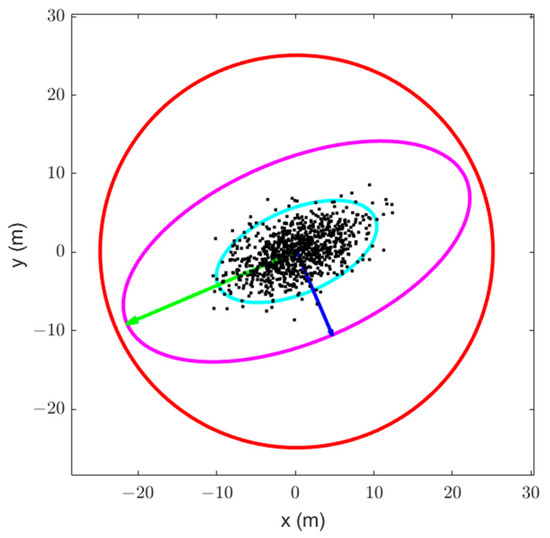 Assuming that 2D positioning data are sampled from a multivariate Gaussian with zero covariance means that both the x-values and the y-values are normally distributed. Therefore, the lefthand side of Equation (A1) actually represents the sum of squares of normally distributed independent data samples. The sum of squared Gaussian data points is known to be distributed according to a Chi-square distribution defined in terms of “degrees of freedom” (DoF), which represent the number of unknowns. In a bi-dimensional case, there are two unknowns and 2-DoF. Therefore, the probability of the sum (A1) is less than or equal to a specific value obtained from the cumulative Chi-square 2-DoF (n = 2) distribution or in other words cumulative Rayleigh distribution. In the 2-DoF Chi-square case, a 95% confidence interval corresponds to s ≈ 5.991. The axis-aligned error ellipse can therefore be drawn as an ellipse with semi-axes lengths a, b equal to:
