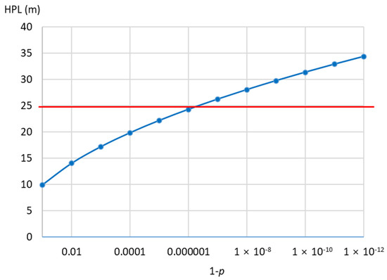 Assuming that two-dimensional (2D) positioning data are sampled from a multivariate Gaussian with zero covariance, the sum of squared Gaussian data points is known to be distributed according to a Chi-square distribution. In such a case, to get the fault-free HPL (the faulted cases are identified via health flags or PNT data processing) of confidence corresponding to the probability of 99.99992%, a coverage factor of kHPL ≈ 5.29 should be used as suggested in Figure 4 and explained in Appendix B. In [31], one can also find the detailed algorithm of HPL calculation, using SBAS integrity data, leading to the solution of the Equations (6) and (7).