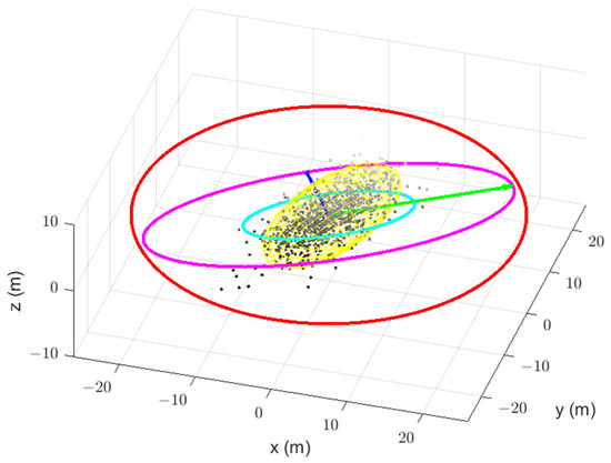 Assuming that 3D positioning data are sampled from a multivariate Gaussian, the k-factor can be obtained from the cumulative Chi-square 3-DoF (n = 3) distribution or the cumulative Maxwell distribution. Other parameters of the ellipsoid’s semi-axes lengths a, b, c and orientation in x-z or y-z plane can be obtained according to formulae analogous to (A3) and (A4).