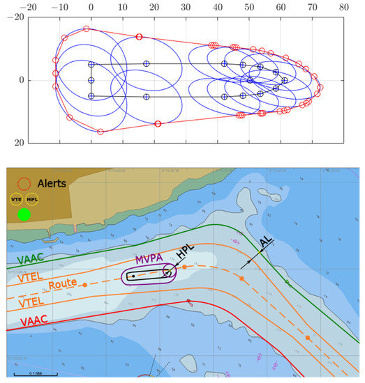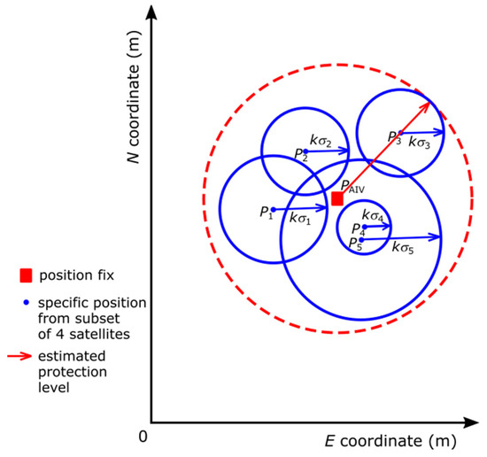 Furthermore, the resolution A.915(22) has not addressed the issue of an algorithm for an upper confidence bound on the position error for IR monitoring. The contemporary shipborne GNSS receivers use mostly RAIM that takes into account either data derived from autonomous GNSS signals without any augmentation or augmented only by Radio Technical Commission for Maritime Services (RTCM)/International Association of Marine Aids to Navigation and Lighthouse Authorities (IALA) differential signals [4,16]. This RAIM is based on the health indicator of GNSS signals and simple consistency tests to exclude faulty or disturbed data but does not use more comprehensive performance indicators provided for individual data to control its influence on potential PNT data output. However, a wide variety of RAIM implementations has been developed in the last decades [17,18]. They are realized not only as snapshot schemes testing only the consistency of current measurement but also as averaging and filtering schemes taking into account previous measurements to compensate effects induced by the vessel’s movement. They differ also in applied search strategies for fault detection and isolation, and, if supported, in methods and parameters used for the determination of PNT data uncertainty level. Ultimately, the diversity of RAIM implementations makes it impossible to achieve a general assignment of RAIM approaches to a single integrity level, whereas the achievement of high-level integrity evaluation as proposed in A.915(22) implicates the necessity to determine the absolute magnitude of significant errors and resulting consequences for the accuracy limits of single PNT output data via GBAS or SBAS in a similar way as it was developed for aviation domain [19,20,21]. In aviation, such a magnitude of significant errors calculated as an upper confidence bound has been named “protection level” (PL—see Figure 2).
