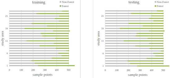 The L8 and S2 images were acquired according to the determined study area locations. For the same study area, cloud-free remote-sensing images of the green season with similar acquisition dates were selected as far as possible to reduce the influence on the classification results in terms of atmospheric conditions, plant phenology, soil moisture, and environmental changes. Both training and testing samples were generated using a stratified random sampling method and interpreted by professionals. The number of sample points in each study area is shown in Figure 2.