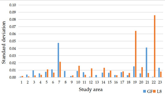 The experimental results from the GF-1 WFV and L8 data show that different processing levels can achieve high classification accuracies in the FNF classification tasks. As shown in Figure 3, the classification results of different processing levels of the data from different areas have a consistent trend of variation. For example, the classification accuracy at all levels in area 10 is high simultaneously, while that in area 11 is low. For the same study area, the results extracted from the data at different processing levels do not differ significantly in terms of metric OA, but the difference is more obvious in some study areas regarding the F1 score. As illustrated in Figure 4, the standard deviation of the data results at different levels in four areas—7, 19, 21, and 22—was significantly larger than that in other study areas.