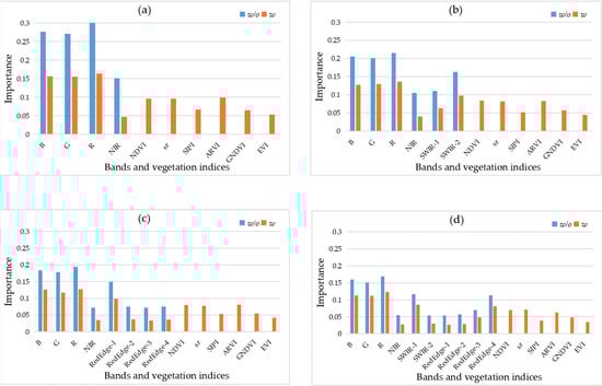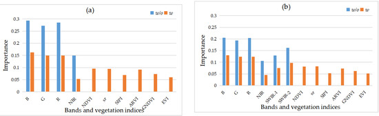 The feature importance of each experiment was highly consistent (as shown in Figure 5 and Figure 6). Among the predictors of each satellite dataset, the R band ranks the highest in importance, followed by the B and G bands. The importance of the characteristics of B, G, and R decreases dramatically with the joining of other bands and vegetation indices but remains above 10% overall and is significantly higher than other bands and vegetation indices. The importance of the vegetation indices did not exceed 10%. The feature importance of the NDVI, sr, and ARVI was comparable in the same group of experiments and higher than that of SIPI, GNDVI, and EVI.