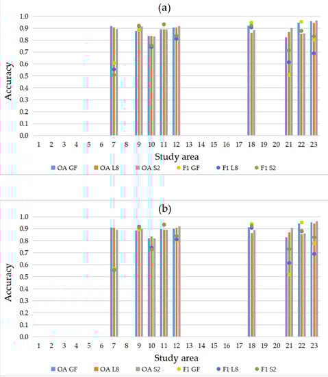 Classification accuracy of different processing levels for FNF classification in each study area, using only the four bands B, G, R, and NIR. (a,b) indicate the classification accuracies of GF-1 WFV and L8, respectively. The histogram represents OA, and the scatter plot represents F1.