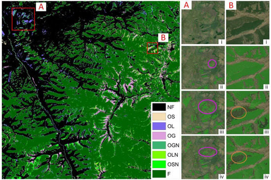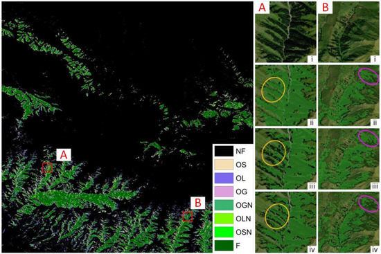 Figure 8, Figure 9, Figure 10 and Figure 11 display the overlay of the different sensor classification results for study areas 21, 9, 23, and 22, respectively. F and NF signify forest and non-forest regions in all the three satellite data classification results, respectively. OS/OL/OG represents only the classification results of S2/L8/GF considered as forest areas. OSN/OLN/OGN indicates that only the classification results of S2/L8/GF are considered non-forest. Columns A–B are the true images of the subregions. In each column, i represents the true images (the true images are from the ESRI satellite map built using the QGIS software, except for Figure 8 (study area 21, where the ESRI satellite map is not an image of the growing season) from Sentinel-2) and ii–iv represent the effect of the superimposition of the true images with the GF, L8, and S2 detection results, respectively.
