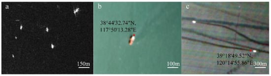 (a) The SAR image with the resolution of 15 m in SSDD dataset [31], The (b) true color image of 460–520 nm, 520–600 nm and 630–690 nm with resolution of 10 m in 38°44′32.74″N,117°50′13.28″E from SDGSAT-1 multispectral imager, and (c) pseudo-color image of 8~10.5 µm, 10.3~11.3 µm, 11.5~12.5 µm with resolution of 30 m in 39°18′49.52″N,120°14′55.86″E from SDGSAT-1 TIS.