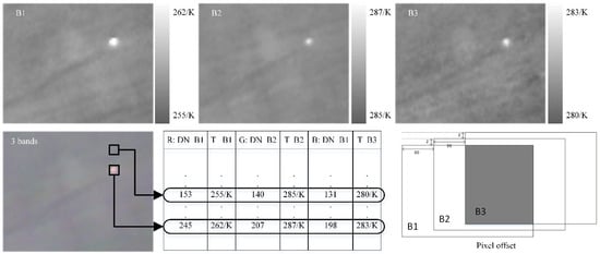 In this paper, B1 channel is 11.5~12.5 µm, B2 channel is 8~10.5 µm, and B3 channel is 10.3~11.3 µm. After B2 translates 30 pixels to the left and B3 translates 60 pixels to the left, image fusion can be carried out after registration with B1, corresponding to the R, G, and B channels of fusion images, as shown in Figure 2.