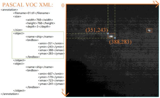 After registration and up-sampling, the LabelImg software is used to annotate triple-channel pseudo-color patches with a resolution of 10 m. Specifically, in PASCAL VOC XML annotation format, bndbox represents the four coordinate values in the upper left and lower right corner of the annotation box. Additionally, it should be noted that the coordinate origin is the upper left corner of the picture, as shown in Figure 3.
