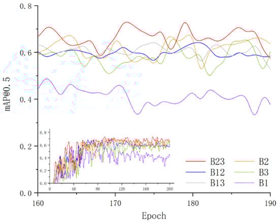 The mAP@0.5 of combined bands B23, B12, B13, and single band B1, B2, B3 in 200 epochs.