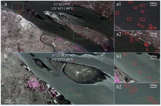 The results of nighttime ship detection by using the TISD in (a) Shanghai Port and (b) sea near Pudong Airport. (The red boxes show the correct vessel detected, the yellow boxes show false alarms, and the blue boxes show missing alarms).
