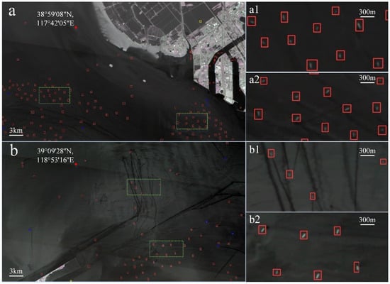 The results of daytime ship detection by using the TISD in (a) Tianjin Port and (b) Partial Sea of Bohai during daytime. (The red boxes show the correct vessel detected, the yellow box shows the false alarm, and the blue boxes show the missing alarms).