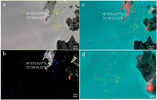 Night images in Mumbai, India with (a) thermal infrared image of 11.5–12.5 µm, 8–10.5 µm, and 10.3–11.3 µm at night (The positive ship detection results are marked in yellow boxes), (b) glimmer image of R:615~690 nm, G:520~615 nm, and B:430~520 nm at night (The observed ships are marked in blue boxes), (c) fusion image of 0.615~0.69 nm, 8~10.5 µm, and 10.3~11.3 µm with the resolution of 10 m (Ships observed in the thermal infrared image but not in the glimmer data are marked in yellow boxes, and ships observed by both are marked in blue boxes), (d) an enlarged image of the green box in c.
