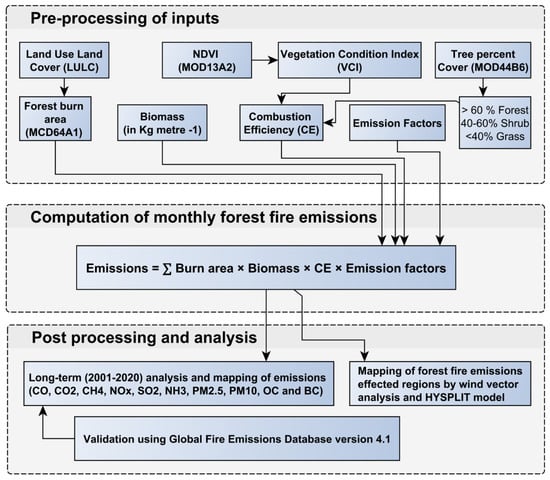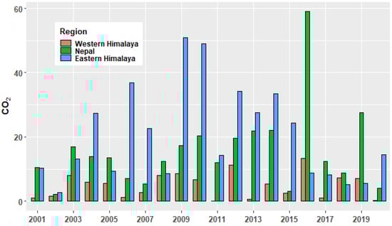 Bar, S.; Parida, B.R.; Pandey, A.C.; Kumar, N. Pixel-Based Long-Term (2001–2020) Estimations of Forest Fire Emissions over the Himalaya. Remote Sens. 2022, 14, 5302. https://doi.org/10.3390/rs14215302