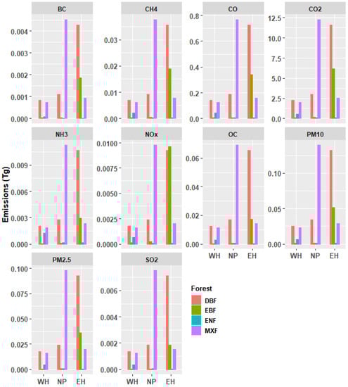 | Forest Types | CO | CO2 | CH4 | NOx | SO2 | NH3 | PM2.5 | PM10 | OC | BC |