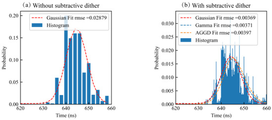 where is the combination of noise terms. The generalized Gaussian distribution (GGD) and the exponentially-modified Gaussian distribution (EMGD) are used to model the sum of Gaussian and uniform noise terms [23,24]. Furthermore, Raghuram et al. have compared various methods based on the mean, median, and other symmetric linear combinations of order statistics to estimate mixed noise terms. As shown in Figure 2b, the photon counting histogram with dithering obtains a finer resolution. Here, the Gaussian distribution is a reasonable approximation to the dithered histogram rather than the Gamma distribution and asymmetric generalized Gaussian distribution (AGGD), which is a generalization of the GGD. The root mean squared error fitted with a Gaussian function decreases from 0.029 to 0.004 ns after a subtractive dither measurement. The photon counting histogram approximates the Gaussian distribution.