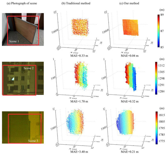 Targets with distinctive features and different distances form the three imaging scenes. As shown in Figure 5a, scene 1 is an inclined board at ~88 m, scene 2 has stepped surface features at ~1.3 km, and scene 3 varies in depth along with spatial dimensional at ~1.8 km. The detected photons data of scene 2 and scene 3 are acquired with a maximum power of 2.5 W. The sampling factor remains at 10 in all the experiments. The reconstruction images using the traditional method are shown in Figure 5b, and the imaging results with RSPE are demonstrated in Figure 5c. The color bars on the right side show the distances from the target to the detector, calculated from the ToF. Compared with the traditional MLE method, the RSPE reduces the MAE by 8.3, 5.3, and 16.2 with ~6 ppp. The improvement is more significant at long-range imaging and low SNR, and is related to the surface features of the target.