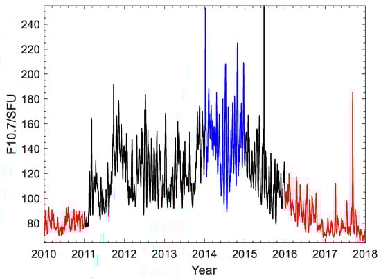 As the solar EUV radiation is the main source for the neutral gas to ionize and it can be inferred by F10.7, this paper adopts the F10.7 index which is downloaded from NOAA (ftp://ftp.swpc.noaa.gov/pub/indices/old_indices/, (accessed on 20 October 2022)) to represent the solar activity. Figure 1 displays the overall variation of the solar F10.7 index from 2010 to 2017. As shown in Figure 1, the F10.7 was the greatest in 2014 among these 8 years, with an average value of 145.9 SFU. The F10.7 was small in 2010, 2016, and 2017, with mean values being 80SFU, 8.7 SFU, and 77.3 SFU, respectively. It is of great importance to note that only the first half of foF2 data in 2016 and 2017 are available for the Yakutsk station, while only the second half of foF2 data are available for 2010. Therefore, this paper used 2014 for the high-solar-activity periods (represented with blue line in Figure 1) and used 2010/2016/2017 for the low solar activity periods (represented with red line in Figure 1) to study τ variation in low-solar-activity years at Yakutsk. Moreover, this paper defined summer (May to August), winter (January, February, November, and December), and equinox (March, April, September, and October) according to the classification of Lloyd season.