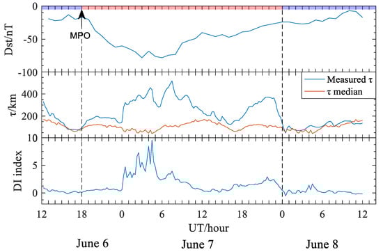 where and are the storm-time τ, and corresponding monthly median τ, respectively. Moreover, the monthly median is the median of a 27-day running window centering for the observed day. Figure 2 displays an example during the period 6 June 6 12 UT–8 June 12 UT in 2013 at Yakutsk. Figure 2 shows the Dst variation during this period (top panel), and it can be seen from the figure that the main phase onset of the geomagnetic storm is at 18:00 UT on June 6; the middle panel shows the measured τ (blue line) and corresponding τ median (red line) during 6–8 June; the bottom panel presents the DI index of τ according to Equation (1), using the measured τ and its median value. It is important to note that DI indexes are classified into storm-time DI index and quiet-time DI index to study their characteristics during the geomagnetic storm and geomagnetic quiet conditions, respectively. For example, the DI index in the storm-time period (colored in red) is used to study the features of DI index during geomagnetic storms, while DI index in the quiet-time period (colored in purple) is used to study the one at geomagnetic quiet conditions.