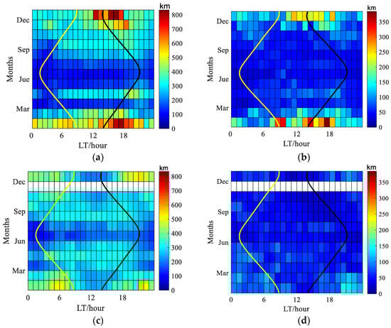 According to the 0–23 LT and January–December grid division, Figure 3 displays the median and standard deviation of τ during the geomagnetic quiet period in the high- and low-solar-activity years at Yakutsk. It is important to note that the foF2 data are not available in November of 2010/2016/2017; the mean and standard deviation of τ in November are therefore white colored in the figures of low-solar-activity years. In addition, the sunrise (represented by yellow line) and sunset (represented by black line) time are shown in Figure 3. It can be seen from the figure that the τ is greatest in winter, followed by equinox, and smallest in summer in both high- and low-solar-activity years, except in the noontime of low-solar-activity years, as shown in Figure 3c. Moreover, the τ shows a completely different diurnal variation in winter of high- and low-solar-activity years. Specifically, it reaches its maximum during the noon to sunset hours and keeps relatively small during the nighttime in high-solar-activity years, while it stays large during 16 LT–06 LT, and it is the smallest at noon in low-solar-activity years. In addition, the τ has the highest variability in the winter, as shown in in the standard deviation of τ in Figure 3b,d. The figure also demonstrates that the τ in summer and equinox have smaller diurnal variations when compared to the τ in winter, and there are peaks with different magnitudes in the sunrise and post-sunset periods. Moreover, the τ in the summer and equinox seems to have a larger standard deviation in low-solar-activity years than in high-solar-activity years.