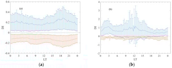 This paper uses the DI index to evaluate the geomagnetic activity effect on the slab thickness, as described above. To demonstrate the difference of τ between storm time and quiet time, we first calculated the DI index during quiet time. According to whether the DI is positive or negative, the daily variation of the mean and standard deviation of the DI index are shown separately. The positive DI variation is represented by blue curves, and the negative DI variation is represented by red curves. As shown in Figure 5a, the magnitude of the ionospheric slab thickness perturbation at Yakutsk station is relatively stable at all times of the day, with the DI index fluctuating between −0.18 and 0.29. In addition, the disturbance is more intense during the sunset time compared with other periods, and the positive/negative DI index is at least greater than 0.21/less than −0.15 within 16:00–20:00 LT, with the DI index reaching a maximum/minimum of 0.29/−0.18, respectively, at 17:30 LT.